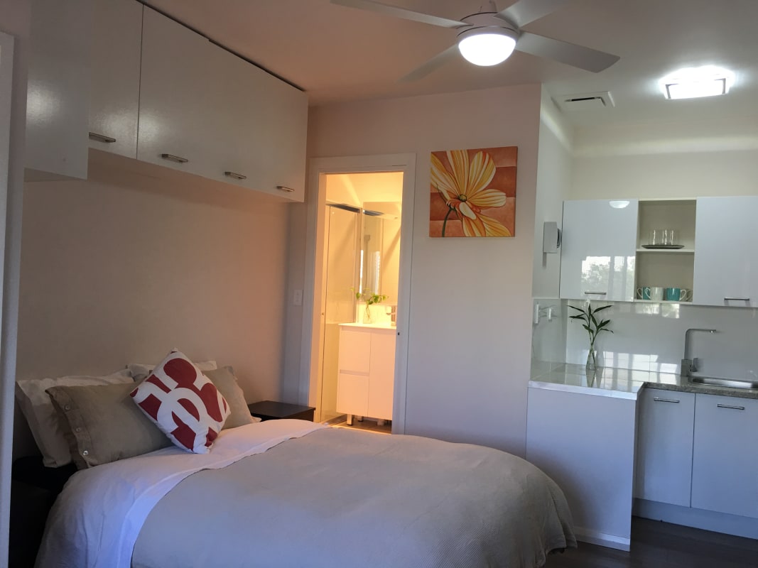 Studio roo m, self-contained studio, with own private entry, modern bathroom, kitchenette facilities, washing machine, Queen bed, tv, microwave, toaster, kettle, fridge, wardrobe, dining table, (Learn More)